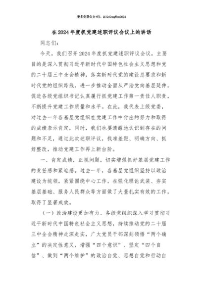 / 【七哥公文】2024年:在2024年度抓党建述职评议会议上的讲话+更多免费公文+VX:QiGeGongWen2024