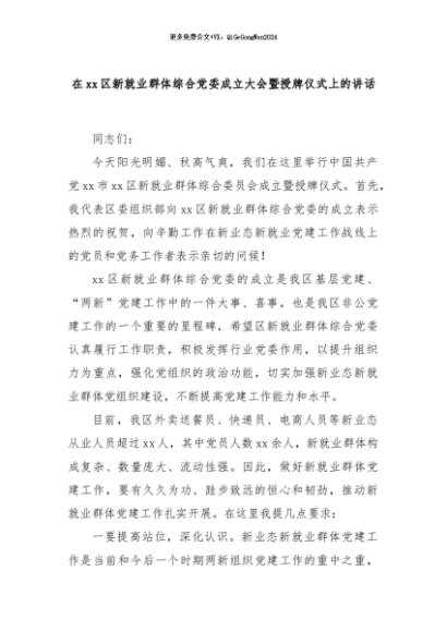 【七哥公文】2024年:在xx区新就业群体综合党委成立大会暨授牌仪式上的讲话+更多免费公文+VX:QiGeGongWen2024