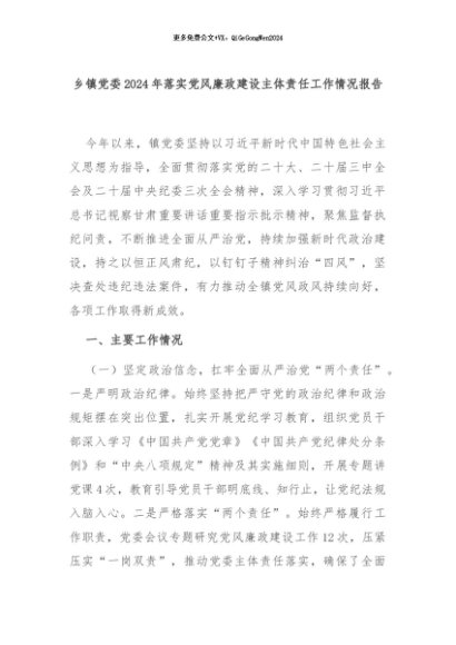 【七哥公文】2024年:乡镇党委2024年落实党风廉政建设主体责任工作情况报告+更多免费公文+VX:QiGeGongWen2024