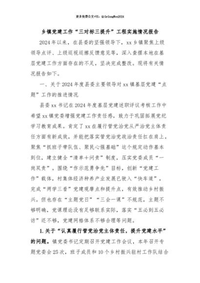 / 【七哥公文】2024年:乡镇党建工作“三对标三提升”工程实施情况报告+更多免费公文+VX:QiGeGongWen2024