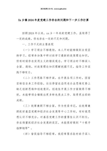【七哥公文】2024年:Xx乡镇2024年度党建工作存在的问题和下一步工作打算+更多免费公文+VX:QiGeGongWen2024