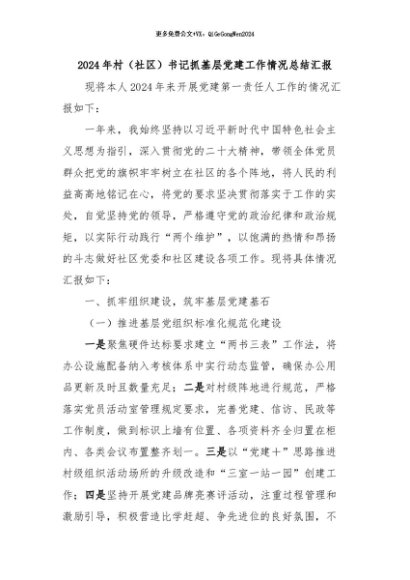 【七哥公文】2024年:2024年村(社区)书记抓基层党建工作情况总结汇报+更多免费公文+VX:QiGeGongWen2024