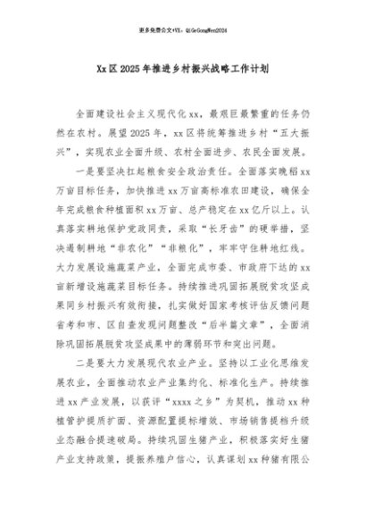 【七哥公文】2024年:Xx区2025年推进乡村振兴战略工作计划+更多免费公文+VX:QiGeGongWen2024