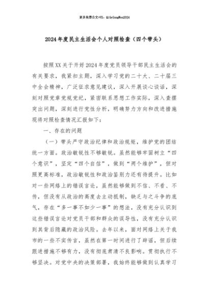 / 【七哥公文】2024年:2024年度民主生活会个人对照检查(四个带头)+更多免费公文+VX:QiGeGongWen2024