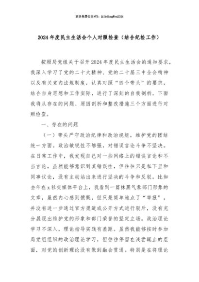 【七哥公文】2024年:2024年度民主生活会个人对照检查(结合纪检工作)+更多免费公文+VX:QiGeGongWen2024