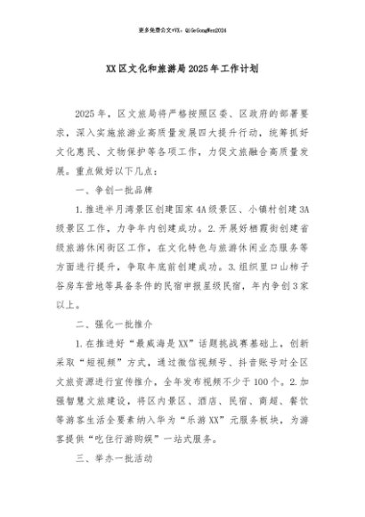 / 【七哥公文】2024年:XX区文化和旅游局2025年工作计划+更多免费公文+VX:QiGeGongWen2024