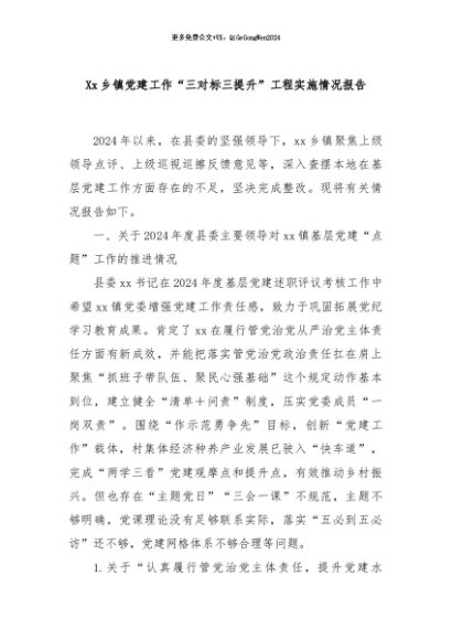 / 【七哥公文】2024年:Xx乡镇党建工作“三对标三提升”工程实施情况报告+更多免费公文+VX:QiGeGongWen2024