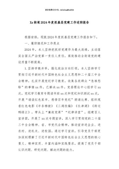 / 【七哥公文】2024年:Xx街道2024年度抓基层党建工作述职报告+更多免费公文+VX:QiGeGongWen2024