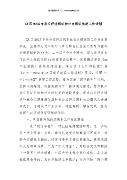 【七哥公文】2024年:XX区2025年非公经济组织和社会组织党建工作计划+更多免费公文+VX:QiGeGongWen2024