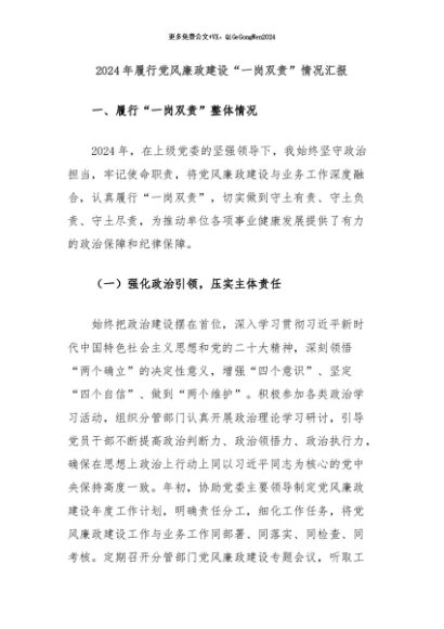 / 【七哥公文】2024年:2024年履行党风廉政建设“一岗双责”情况汇报+更多免费公文+VX:QiGeGongWen2024