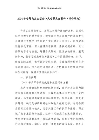 【七哥公文】2024年:2024年专题民主生活会个人对照发言材料(四个带头)+更多免费公文+VX:QiGeGongWen2024