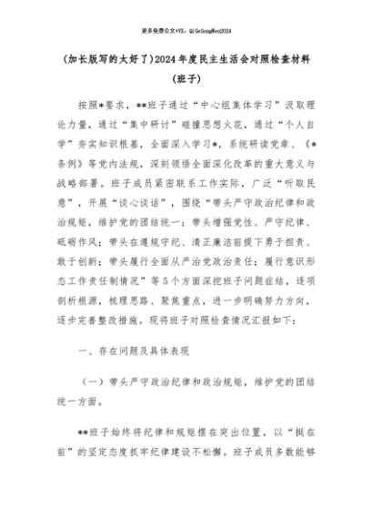 【七哥公文】2024年:(加长版写的太好了)2024年度民主生活会对照检查材料(班子)+更多免费公文+VX:QiGeGongWen2024