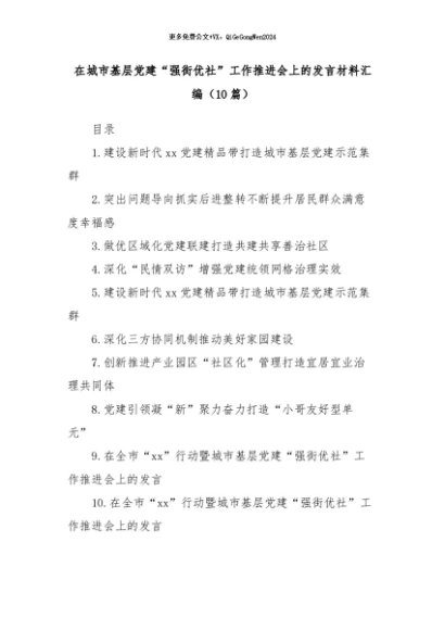 【七哥公文】2024年:(10篇)在城市基层党建“强街优社”工作推进会上的发言材料汇编+更多免费公文+VX:QiGeGongWen2024