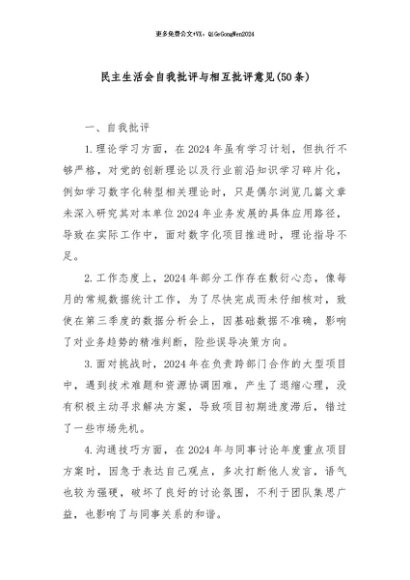 / 【七哥公文】2024年:(50条)民主生活会自我批评与相互批评意见+更多免费公文+VX:QiGeGongWen2024