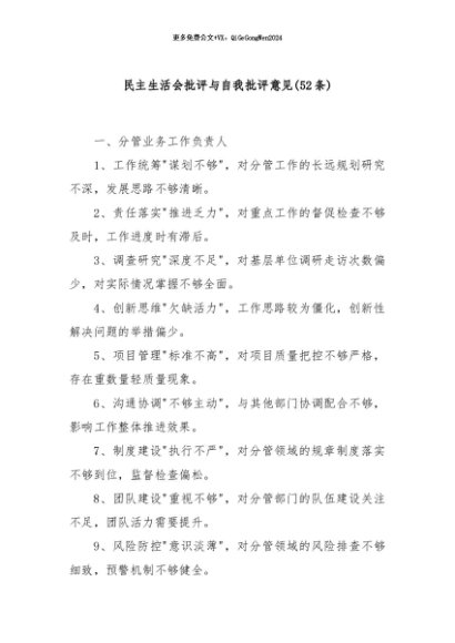 / 【七哥公文】2024年:(52条)民主生活会批评与自我批评意见+更多免费公文+VX:QiGeGongWen2024