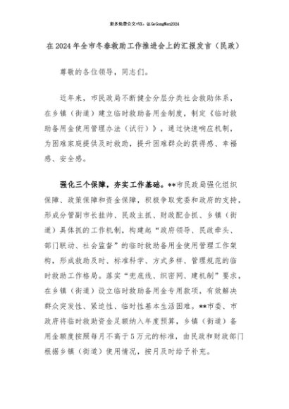 【七哥公文】2024年:在2024年全市冬春救助工作推进会上的汇报发言(民政)+更多免费公文+VX:QiGeGongWen2024