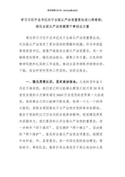 【七哥公文】2024年:学习习近平总书记关于全面从严治党重要论述心得感悟:深化全面从严治党凝聚干事创业力量+更多免费公文+VX:QiGeGongWen2024