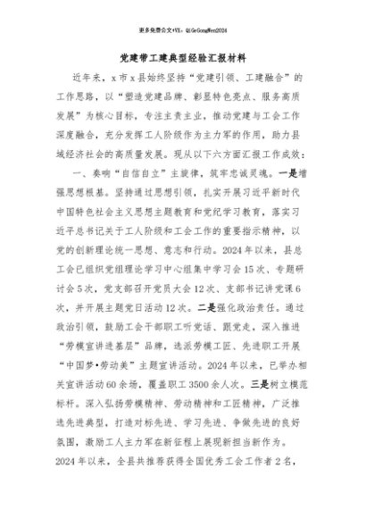 / 【七哥公文】2024年:党建带工建典型经验汇报材料+更多免费公文+VX:QiGeGongWen2024