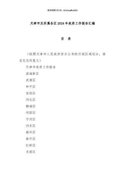 【七哥公文】2024年:天津市及所属各区2024年政府工作报告汇编+更多免费公文+VX:QiGeGongWen2024