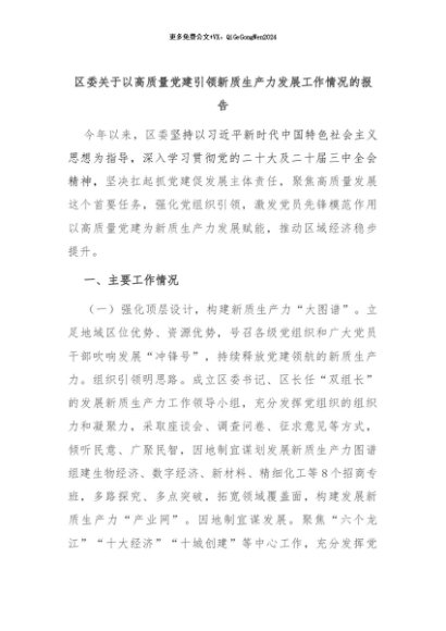 【七哥公文】2024年:区委关于以高质量党建引领新质生产力发展工作情况的报告+更多免费公文+VX:QiGeGongWen2024