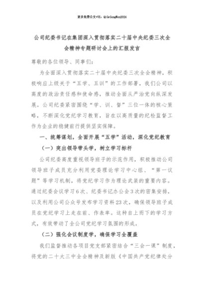 【七哥公文】2024年:公司纪委书记在集团深入贯彻落实二十届中央纪委三次全会精神专题研讨会上的汇报发言+更多免费公文+VX:QiGeGongWen2024