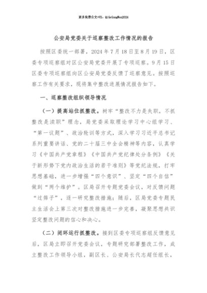/ 【七哥公文】2024年:公安局党委关于巡察整改工作情况的报告+更多免费公文+VX:QiGeGongWen2024