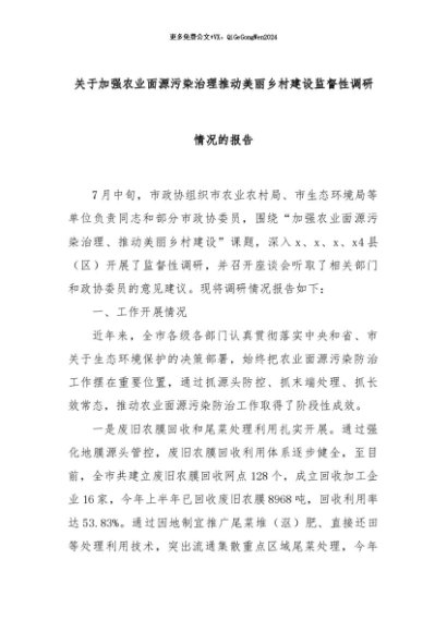 【七哥公文】2024年:关于加强农业面源污染治理推动美丽乡村建设监督性调研情况的报告+更多免费公文+VX:QiGeGongWen2024