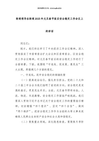 【七哥公文】2024年:街道领导在街道2025年元旦春节前后安全稳定工作会议上的讲话+更多免费公文+VX:QiGeGongWen2024