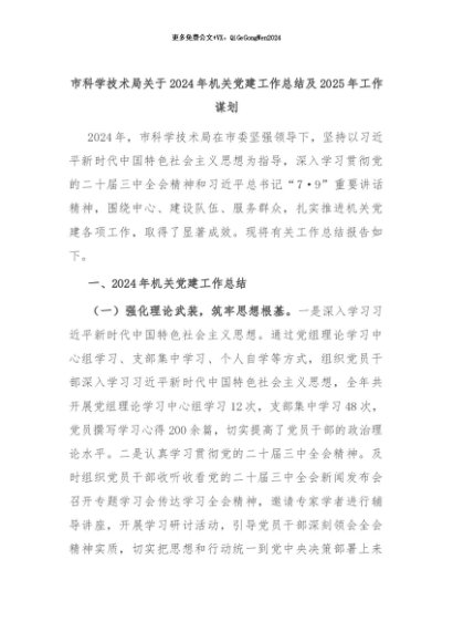 【七哥公文】2024年:市科学技术局关于2024年机关党建工作总结及2025年工作谋划+更多免费公文+VX:QiGeGongWen2024