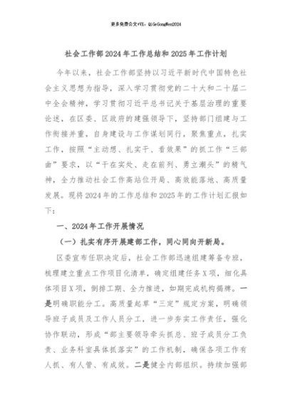 / 【七哥公文】2024年:社会工作部2024年工作总结和2025年工作计划+更多免费公文+VX:QiGeGongWen2024