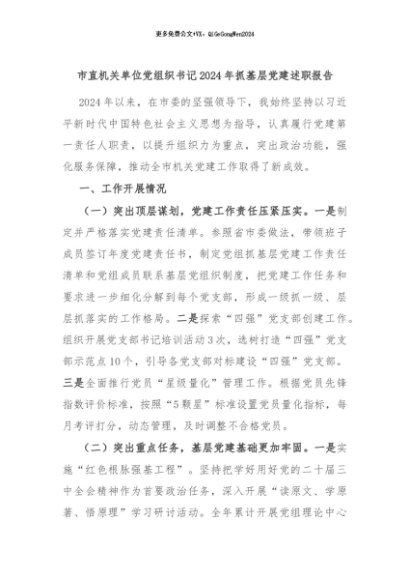 【七哥公文】2024年:市直机关单位党组织书记2024年抓基层党建述职报告+更多免费公文+VX:QiGeGongWen2024