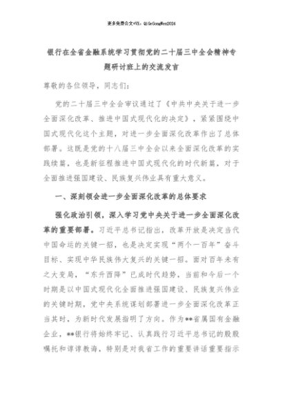 【七哥公文】2024年:银行在全省金融系统学习贯彻党的二十届三中全会精神专题研讨班上的交流发言+更多免费公文+VX:QiGeGongWen2024