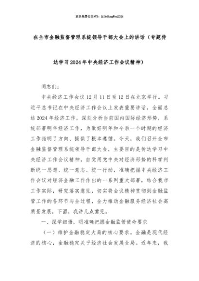 【七哥公文】2024年:在全市金融监督管理系统领导干部大会上的讲话(专题传达学习2024年中央经济工作会议精神)+更多免费公文+VX:QiGeGongWen2024