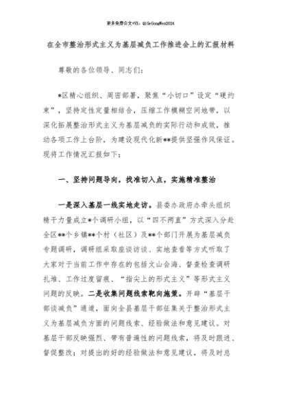 【七哥公文】2024年:在全市整治形式主义为基层减负工作推进会上的汇报材料+更多免费公文+VX:QiGeGongWen2024