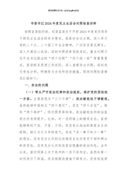 / 【七哥公文】2024年:市委书记2024年度民主生活会对照检查材料+更多免费公文+VX:QiGeGongWen2024