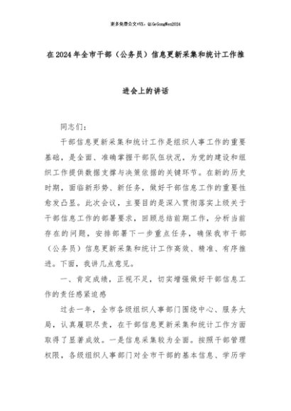 【七哥公文】2024年:在2024年全市干部(公务员)信息更新采集和统计工作推进会上的讲话+更多免费公文+VX:QiGeGongWen2024