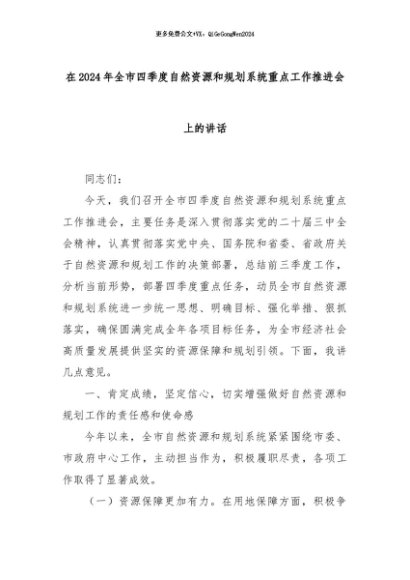 【七哥公文】2024年:在2024年全市四季度自然资源和规划系统重点工作推进会上的讲话+更多免费公文+VX:QiGeGongWen2024