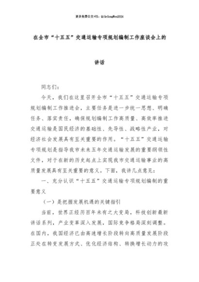 【七哥公文】2024年:在全市“十五五”交通运输专项规划编制工作座谈会上的讲话+更多免费公文+VX:QiGeGongWen2024