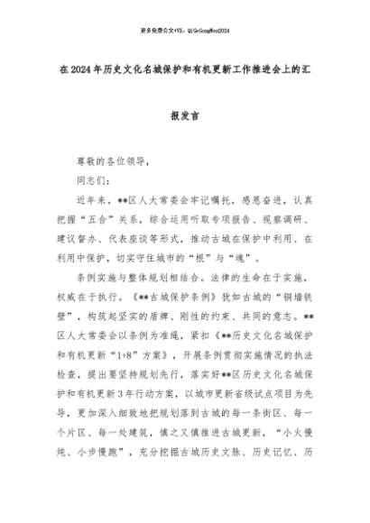 【七哥公文】2024年:在2024年历史文化名城保护和有机更新工作推进会上的汇报发言+更多免费公文+VX:QiGeGongWen2024