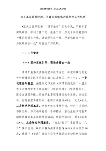 / 【七哥公文】2024年:四下基层典型经验:丰富实践载体形成良性工作机制+更多免费公文+VX:QiGeGongWen2024