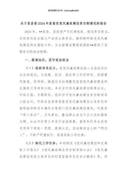 【七哥公文】2024年:关于某县委2024年度落实党风廉政建设责任制情况的报告+更多免费公文+VX:QiGeGongWen2024