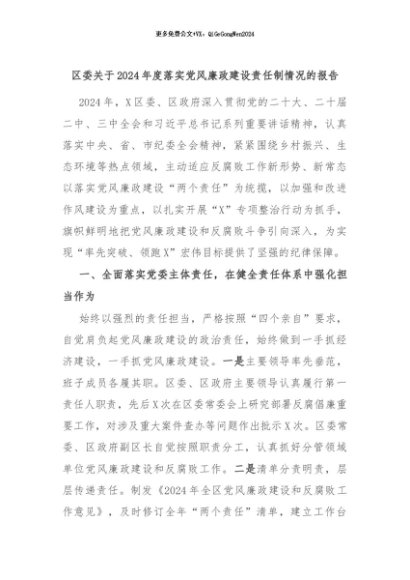 【七哥公文】2024年:区委关于2024年度落实党风廉政建设责任制情况的报告+更多免费公文+VX:QiGeGongWen2024