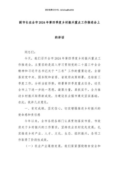 【七哥公文】2024年:副市长在全市2024年第四季度乡村振兴重点工作推进会上的讲话+更多免费公文+VX:QiGeGongWen2024