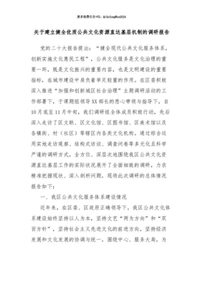 【七哥公文】2024年:关于建立健全优质公共文化资源直达基层机制的调研报告+更多免费公文+VX:QiGeGongWen2024