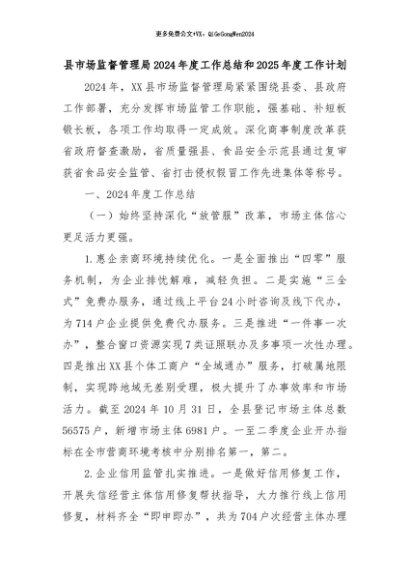 【七哥公文】2024年:县市场监督管理局2024年度工作总结和2025年度工作计划+更多免费公文+VX:QiGeGongWen2024