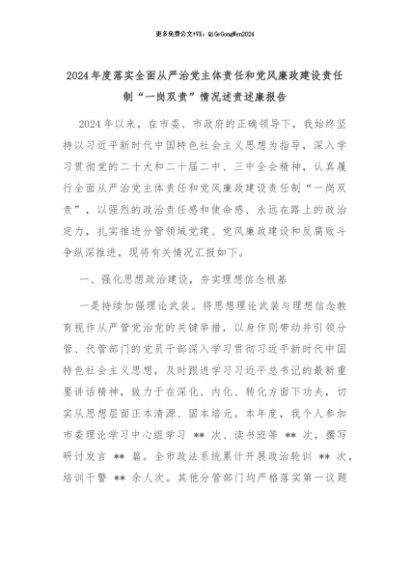 【七哥公文】2024年:2024年度落实全面从严治党主体责任和党风廉政建设责任制“一岗双责”情况述责述廉报告+更多免费公文+VX:QiGeGongWen2024