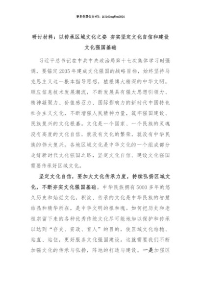 【七哥公文】2024年:研讨材料:以传承区域文化之姿 夯实坚定文化自信和建设文化强国基础+更多免费公文+VX:QiGeGongWen2024