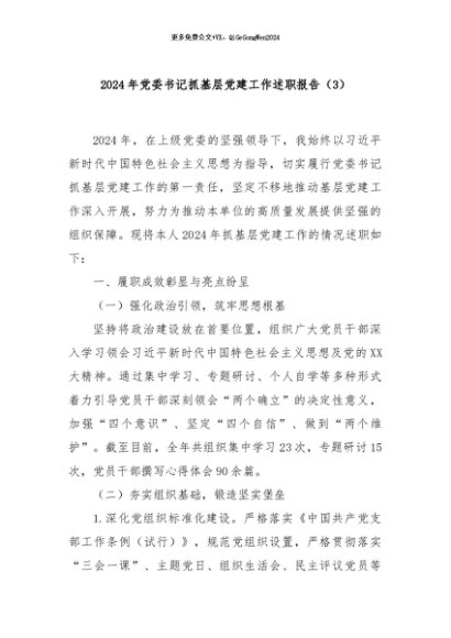 / 【七哥公文】2024年:2024年党委书记抓基层党建工作述职报告(3)+更多免费公文+VX:QiGeGongWen2024