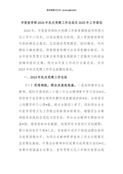 【七哥公文】2024年:市委宣传部2024年机关党建工作总结及2025年工作谋划+更多免费公文+VX:QiGeGongWen2024