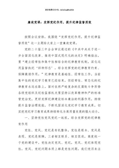 / 【七哥公文】2024年:廉政党课:发挥党纪作用,提升纪律监督质效+更多免费公文+VX:QiGeGongWen2024